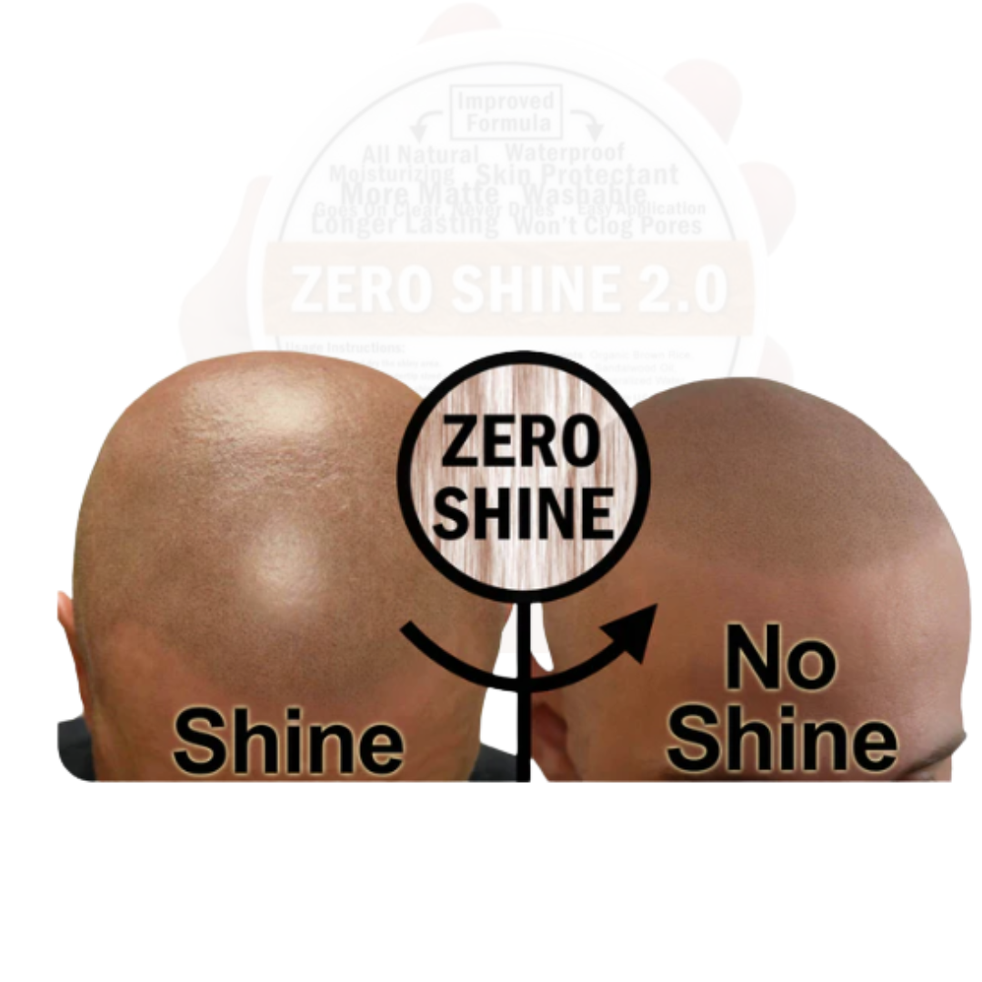 Zero Shine helps stop shine on a bald head. With no hair to absorb your scalp oil, and no follicles to texturize the top of one's head to diffuse light, you need to add that microscopic texture with Zero Shine by DermiMatch. After getting Scalp Micropigmentation done, you will be so excited to see your new look and you'll feel confident for the first time in a long time. However, after the initial luster (pun intended) wears off, you will start to notice that the shininess of your head is causing your new "hair" to not look so realistic. When you see people with actual real hair that's been shaved down, you'll notice that their scalp is not as shiny as yours. Zero Shine has solved this problem by allowing you to remove the shine from your head and mattify it for approximately 24 hours. It can be worn in the pool as it is waterproof. It is an all natural moisturizer. Preserve your scalp and SMP procedure while also giving it a matte effect with Zero Shine.